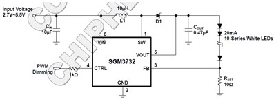 SGM3732屬于新一代高效率串聯(lián)LED驅(qū)動的家族成員之一.擁有1MHz的固定開關(guān)頻率,減小了外部電感的尺寸及內(nèi)部轉(zhuǎn)換電流損耗,可以實現(xiàn)最高達39V的電壓輸出,在輕松支持10英寸屏幕所需的40個高亮LED的同時,保持了較高的轉(zhuǎn)換效率.SGM3732內(nèi)置軟啟動,可以避免開啟大電流沖擊,獨特的外部PWM調(diào)光信號轉(zhuǎn)反饋端電壓調(diào)節(jié)電流的技術(shù),避免了傳統(tǒng)PWM調(diào)光轉(zhuǎn)換芯片帶來的系統(tǒng)噪聲問題,解決了便攜產(chǎn)品系統(tǒng)設(shè)計的技術(shù)難題.