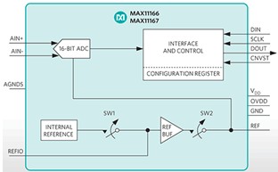 MAX11166和MAX11167通過SPI兼容串口以2.5V、3V、3.3V或5V邏輯電壓進(jìn)行通信,采樣速率分別為500ksps和250ksps。可通過串口將多個ADC菊鏈連接,用于多通道同時采樣;此外器件還提供轉(zhuǎn)換完成信號指示,簡化系統(tǒng)同步和定時。Maxim專有的輸入電荷泵架構(gòu)允許對高阻輸入源直接采樣,從而在一些應(yīng)用中省去了驅(qū)動ADC輸入所需的外部模擬緩沖器。
