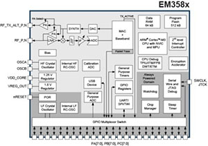 EM358x SoC具有出色的無線性能,可配置的總鏈路負載達110dB。此器件所擁有的8dBm發(fā)射功率消除了許多應用所需的片外功率放大器(PA),尤其是在歐洲和亞洲。因為無線電系統(tǒng)通常會在多種干擾存在的情況下運行,EM358x SoC設計能提供卓越的抗干擾能力和可靠性,可以與其它2.4GHz設備共存。