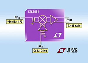 此外,無源混頻器需要高 LO (本機(jī)振蕩器) 驅(qū)動以達(dá)到聲稱的 IIP3。LTC5551 集成了僅需 0dBm 驅(qū)動電平的 LO 緩沖器,因此最大限度地減小了外部電路并降低了成本。由于在用戶接收器中消除了大功率 LO 信號,所以 LTC5551 極大地減少了潛在和不想要的輻射,從而簡化了濾波和 RF 屏蔽要求。