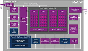 利用 Imagination 的 Wizard 光線跟蹤系列內(nèi)核,此專利的定制硬件引擎能確保 GPU 處理器集簇?zé)o需執(zhí)行復(fù)雜的著色處理,并能以最少的開(kāi)發(fā)工作產(chǎn)生令人驚艷的效果。這款獨(dú)特的硬件光線追蹤處理器包括一致性收集引擎(coherence gathering engine)、固定功能交叉測(cè)試陣列(fixed function intersection testing array)以及加速場(chǎng)景層次產(chǎn)生器(accelerated scene hierarchy generator),從陰影接受光線,決定它們的交集并產(chǎn)生更多的陰影。通過(guò)加入創(chuàng)新的硬件流水線,構(gòu)建場(chǎng)景層次結(jié)構(gòu),光線追蹤與其它操作同時(shí)并發(fā)處理,并保持對(duì)現(xiàn)有的可編程頂點(diǎn)操作的兼容,Wizard GPU實(shí)現(xiàn)了完全動(dòng)態(tài)的場(chǎng)景。