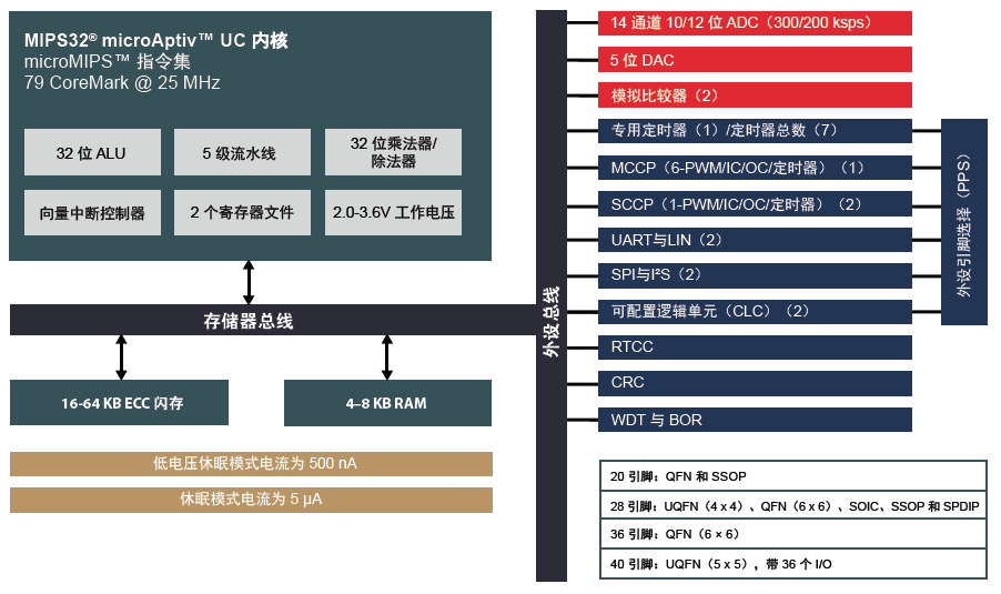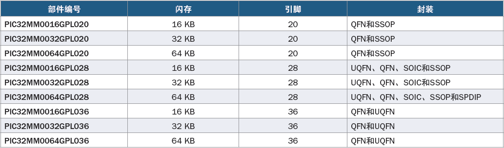 PIC32MM系列是Microchip功耗最低且最具成本效益的32位PIC32單片機(jī)系列。PIC32MM系列填補(bǔ)了我們廣受歡迎的 PIC24F XLP和 PIC32MX系列之間的空白。 PIC32MM器件的休眠模式電流低至 500 nA,封裝尺寸小至 4x4 mm,適用于需要更長電池壽命和更小外形的應(yīng)用。該系列具有獨立于內(nèi)核的外設(shè), 例如可配置邏輯單元( CLC)和多輸出捕捉/比較/ PWM(MCCP),旨在降低 CPU負(fù)荷。PIC32MM系列采用緊湊型 microMIPS?指令、 microAptiv? UC 內(nèi)核和影子寄存器集,在 25 MHz 時可達(dá) 79 CoreMark?評分。 microMIPS ISA整合了 16位和 32位指令,以實現(xiàn)緊湊的代碼。Microchip的 MPLAB®代碼配置器( MCC)支持 PIC32MM器件,有助于簡化設(shè)計。