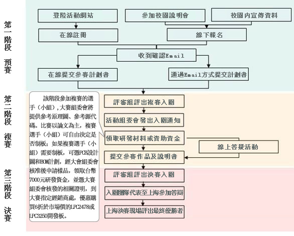 - 以上復(fù)賽協(xié)議書、研發(fā)基金申請表格、PCB設(shè)計圖和BOM計畫審批通過後,組委會將向選手發(fā)放研發(fā)資金。
