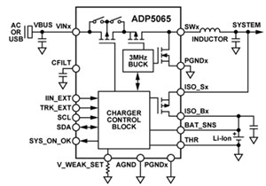 ADP5065充電器完全符合USB 2.0、USB 3.0和USB電池充電規(guī)格1.1,可通過mini-USB VBUS引腳從墻壁充電器、車載充電器或USB主機(jī)端口進(jìn)行充電。其輸入電壓范圍為4 V至5.5 V,最高可耐受20 V電壓。這緩解了斷開或連接時(shí)的USB總線尖峰問題。ADP5065在DC-DC充電器輸出和電池間集成了內(nèi)部FET。這一設(shè)計(jì)可提供“電池隔離”,使系統(tǒng)可在“電池?zé)o電”或“無(wú)電池”情況下供電,從而直接通過USB電源執(zhí)行系統(tǒng)功能。根據(jù)外部USB檢測(cè)芯片檢測(cè)到的USB電源類型,ADP5065可設(shè)置為應(yīng)用正確的電流限值,實(shí)現(xiàn)最佳充電和USB合規(guī)性。ADP5065采用尺寸極小的薄型WLCSP-20(0.5 mm間距)封裝。