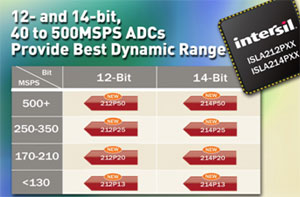 Intersil公司推出具有業(yè)界領(lǐng)先信噪比指標(biāo)和極低功耗的新模數(shù)轉(zhuǎn)換器(ADC)系列---ISLA212Pxx和ISLA214Pxx,使其高速ADC產(chǎn)品系列得到進(jìn)一步擴(kuò)展。新系列產(chǎn)品具有卓越的高頻輸入性能,從而簡(jiǎn)化通訊產(chǎn)品的系統(tǒng)架構(gòu),與傳統(tǒng)基帶架構(gòu)相比,這可以提高可生產(chǎn)性,同時(shí)降低成本。