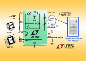 LTC4425 的自動(dòng)能量平衡功能保持兩節(jié)超級(jí)電容器有相等的電壓,從而無(wú)需用于平衡的電阻器,同時(shí)保護(hù)每節(jié)超級(jí)電容器免受過(guò)壓損壞,并最大限度地減少電容器的漏電流。